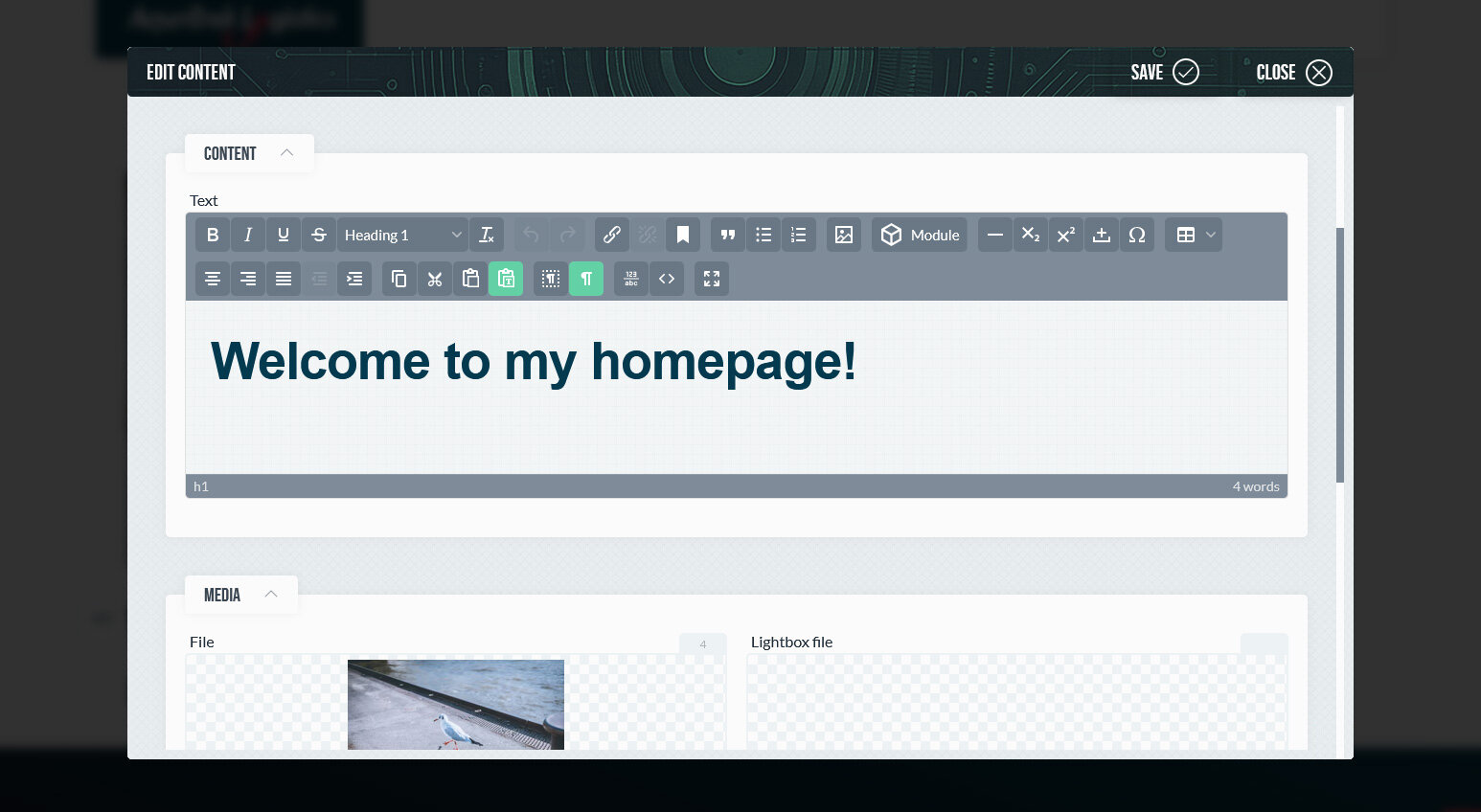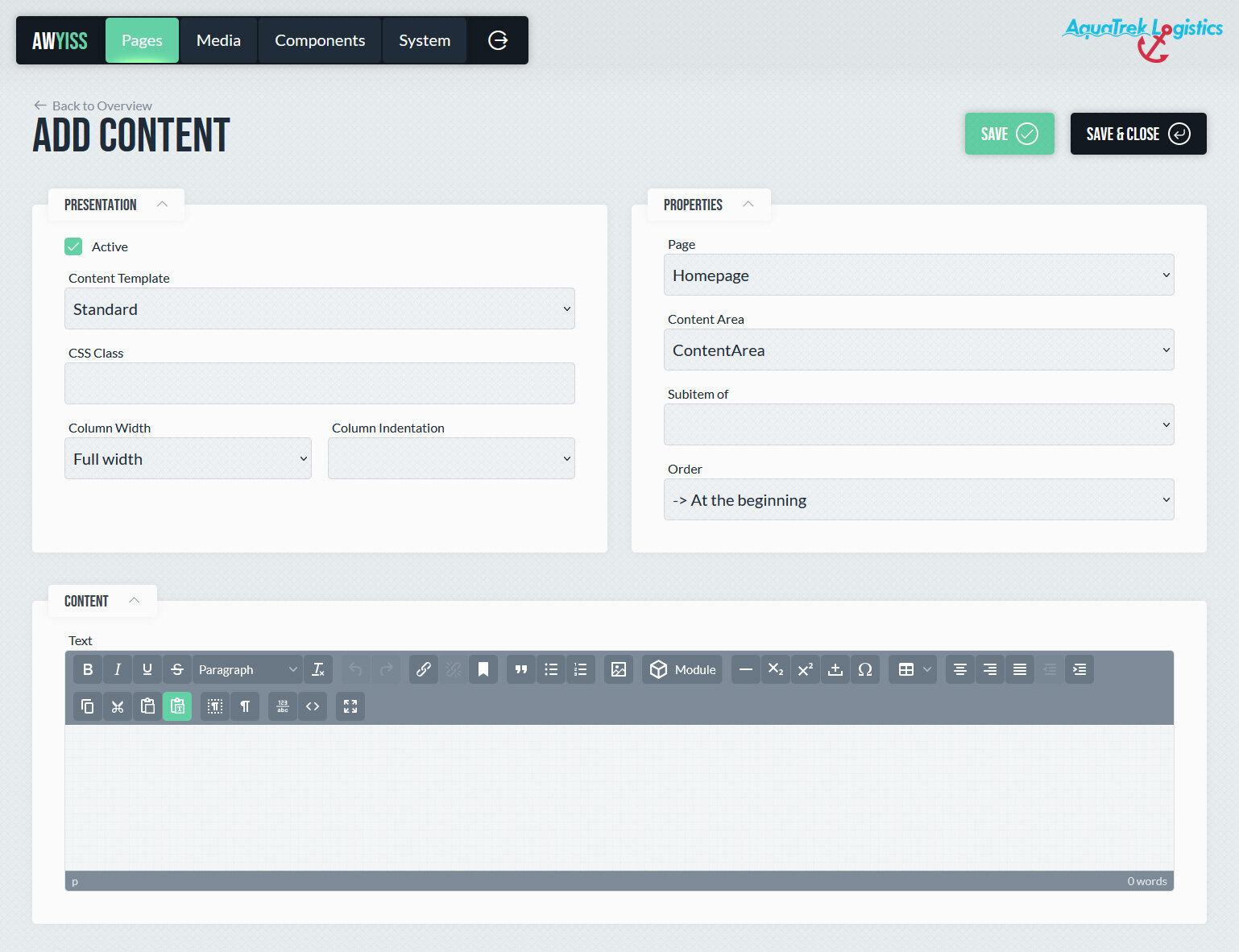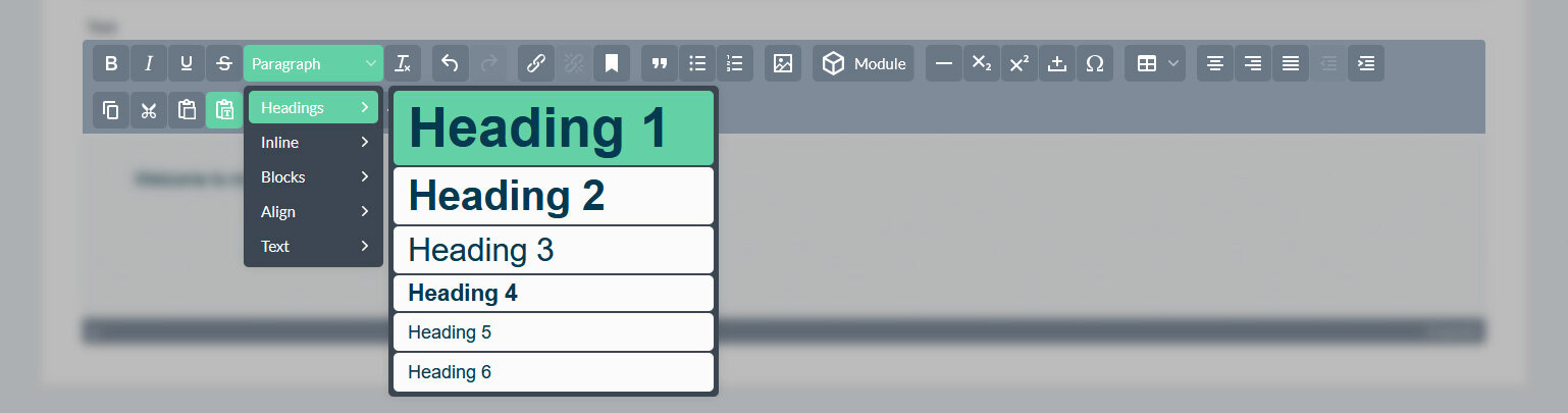 Inhalte basieren auf Inhaltstemplates und können Texte, Bilder, Videos oder individuell definierte Widgets enthalten. Für die Textbearbeitung stehen Rich-Text-Editoren wie TinyMCE oder Jodit mit umfangreichen Formatierungsfunktionen zur Verfügung. Zusätzlich können CSS-Klassen und -Stile, sowie data-Attribute hinterlegt werden, um Darstellung und Verhalten gezielt zu beeinflussen.