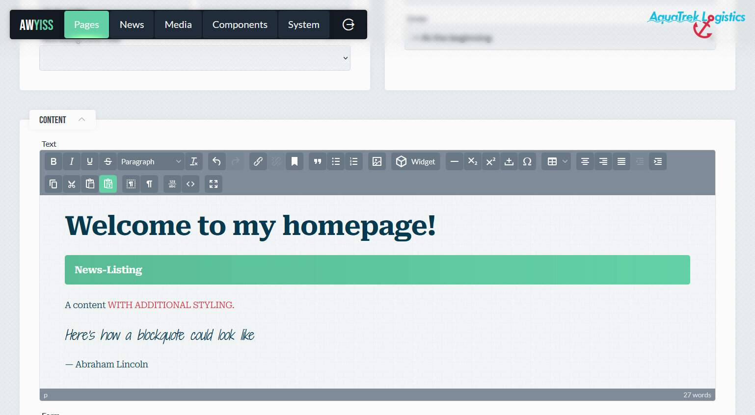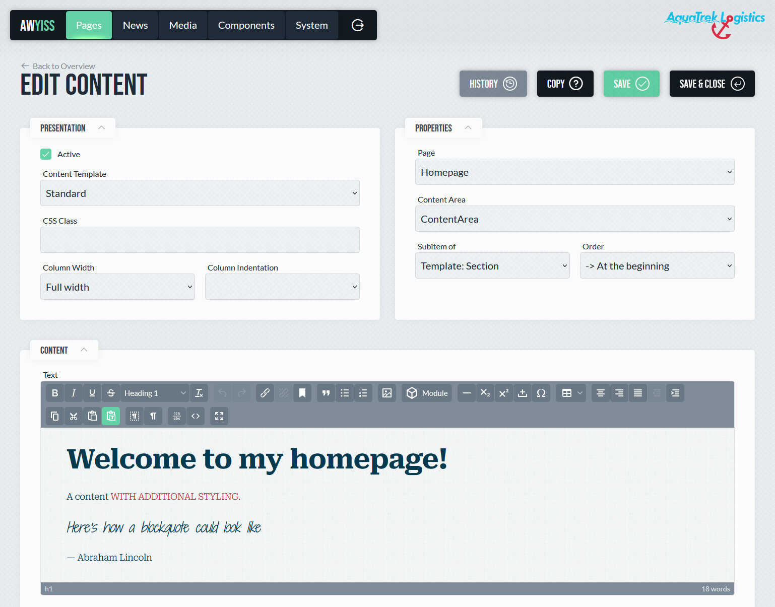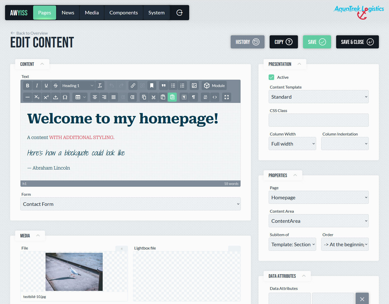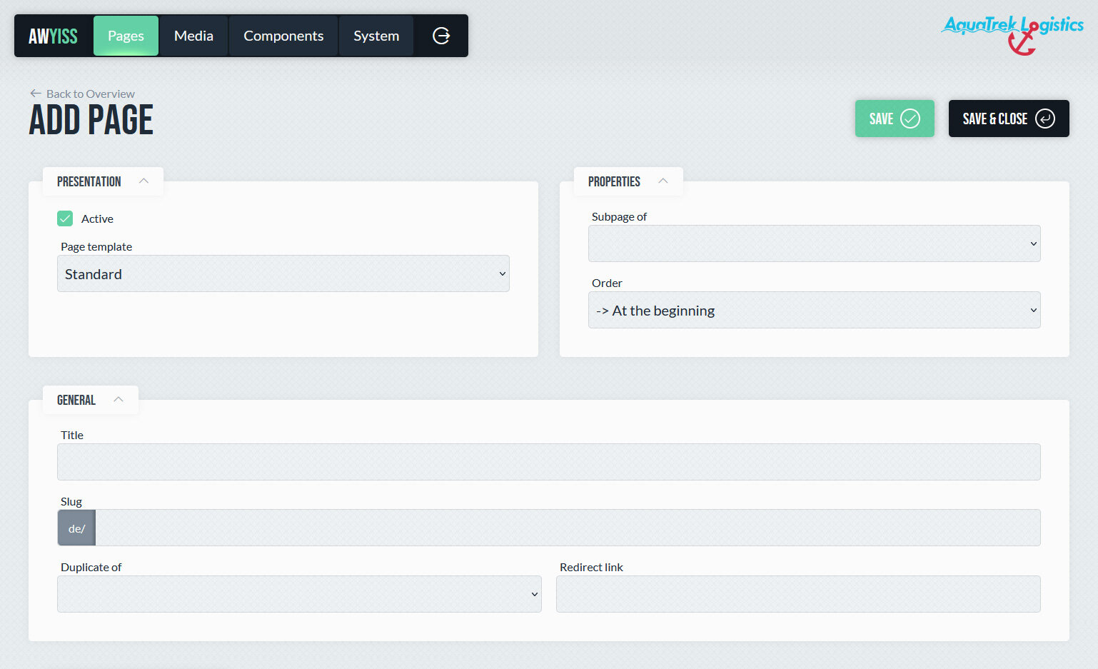 In Awyiss bilden Seiten die grundlegende Einheit einer Website. Es können beliebig viele Seiten angelegt und hierarchisch organisiert werden, wodurch eine klare Struktur im Backend entsteht. Diese Hierarchie wird im Frontend abgebildet und wirkt sich unter anderem auf Breadcrumbs und die URL-Struktur aus. Jede Seite definiert Daten wie Titel, Pfad in der URL und – über das zugewiesene Seitentemplate – die verfügbaren Inhaltsbereiche.