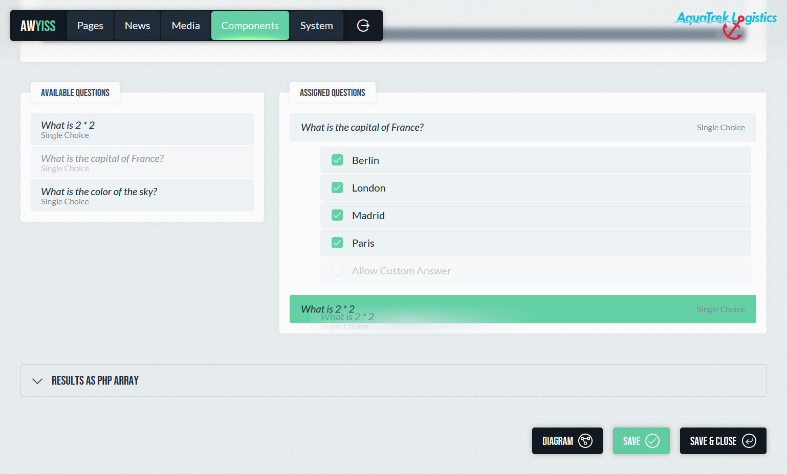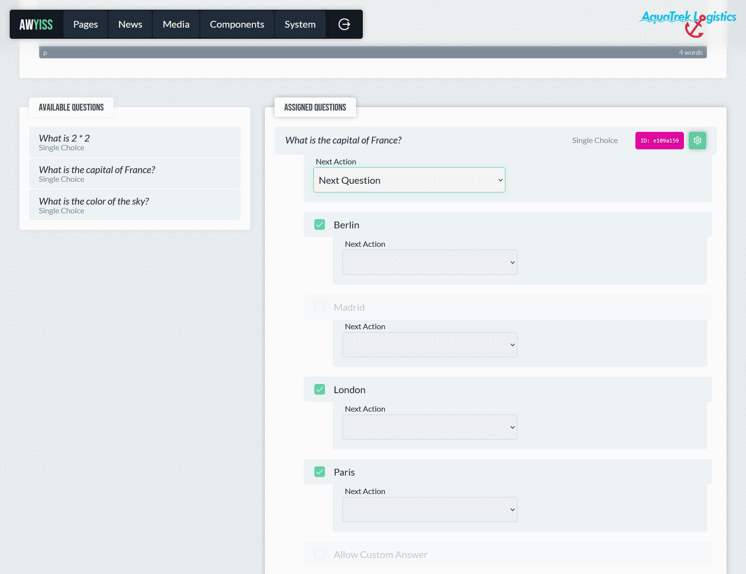 Das Umfrage-System kann nicht nur für klassische Befragungen genutzt werden, sondern auch als Konfigurator dienen. Neben typischen Einsatzbereichen wie Feedback- oder Zufriedenheitsabfragen lassen sich damit auch Schritt-für-Schritt-Auswahlprozesse umsetzen, bei denen Antworten den weiteren Ablauf steuern. So können beispielsweise Produktkonfigurationen, Beratungsstrecken oder thematische Entscheidungsbäume realisiert werden, die Nutzern gezielt unterschiedliche Inhalte, Formulare oder Ergebnisse anzeigen. Dadurch wird das System zu einem vielseitigen Werkzeug für interaktive Inhalte und dynamische Abläufe innerhalb von Awyiss.