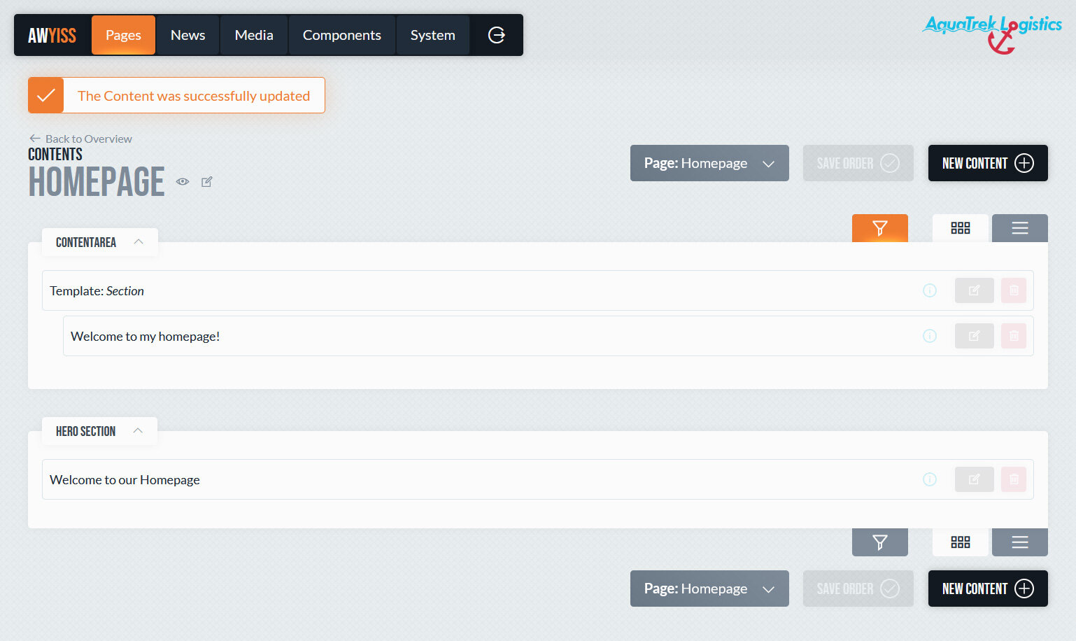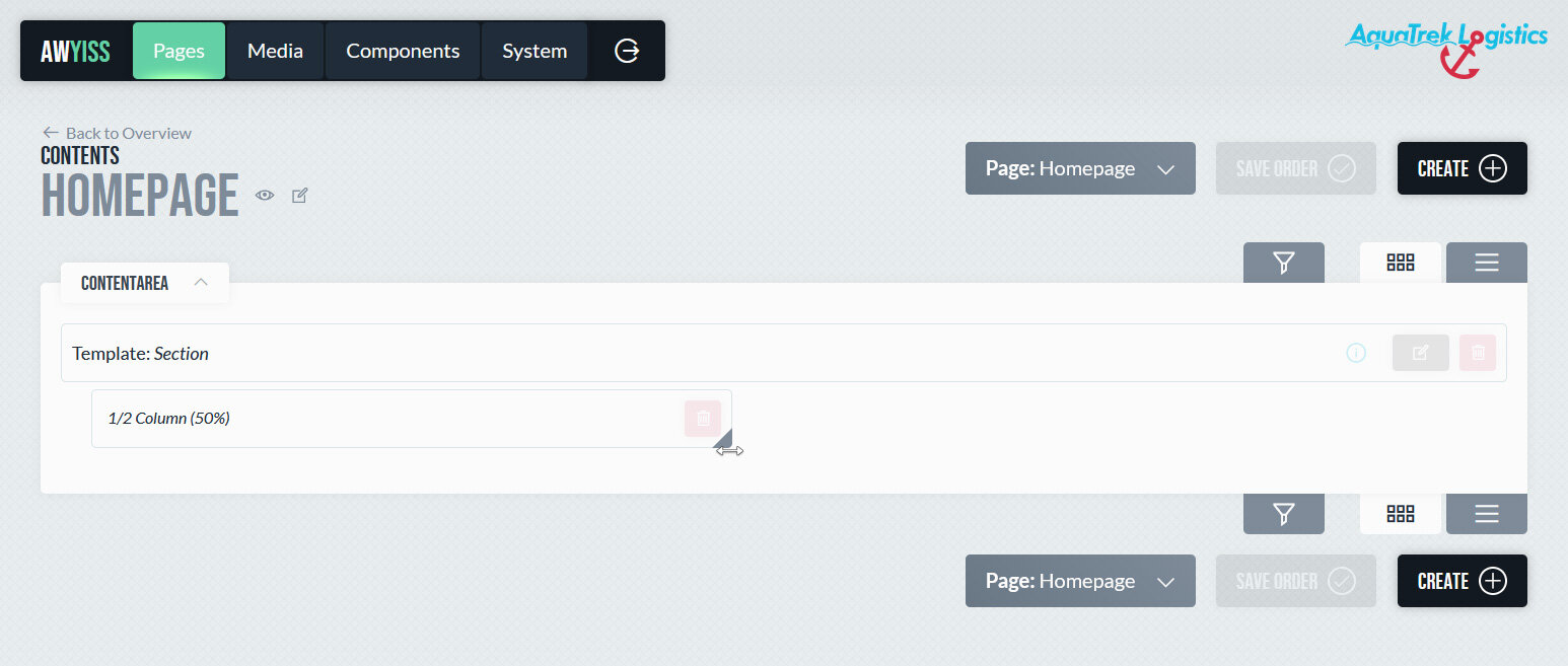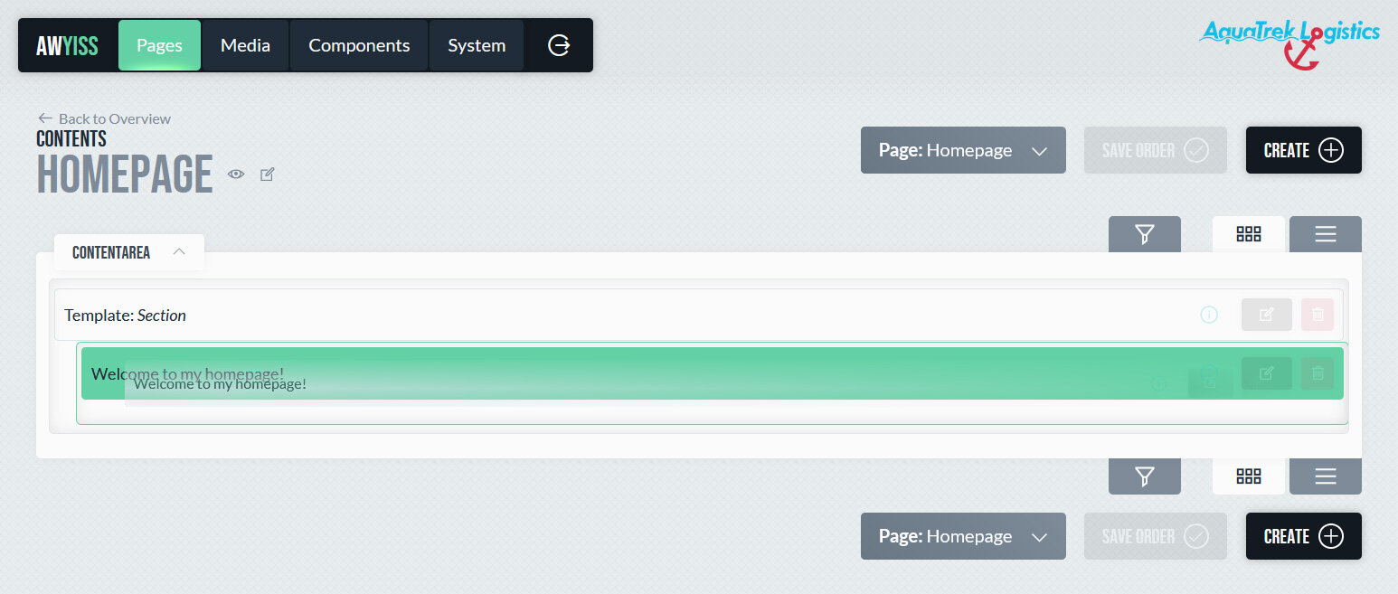 Die eigentlichen Inhalte werden seitenbezogen in einem eigenen Bereich angezeigt und gepflegt. Dort sind alle Inhalte einer Seite im Überblick sichtbar und entsprechend ihrer Spaltenstruktur organisiert. Inhalte können in beliebiger Anzahl erstellt, per Drag-and-Drop angeordnet und flexibel kombiniert oder verschachtelt werden.