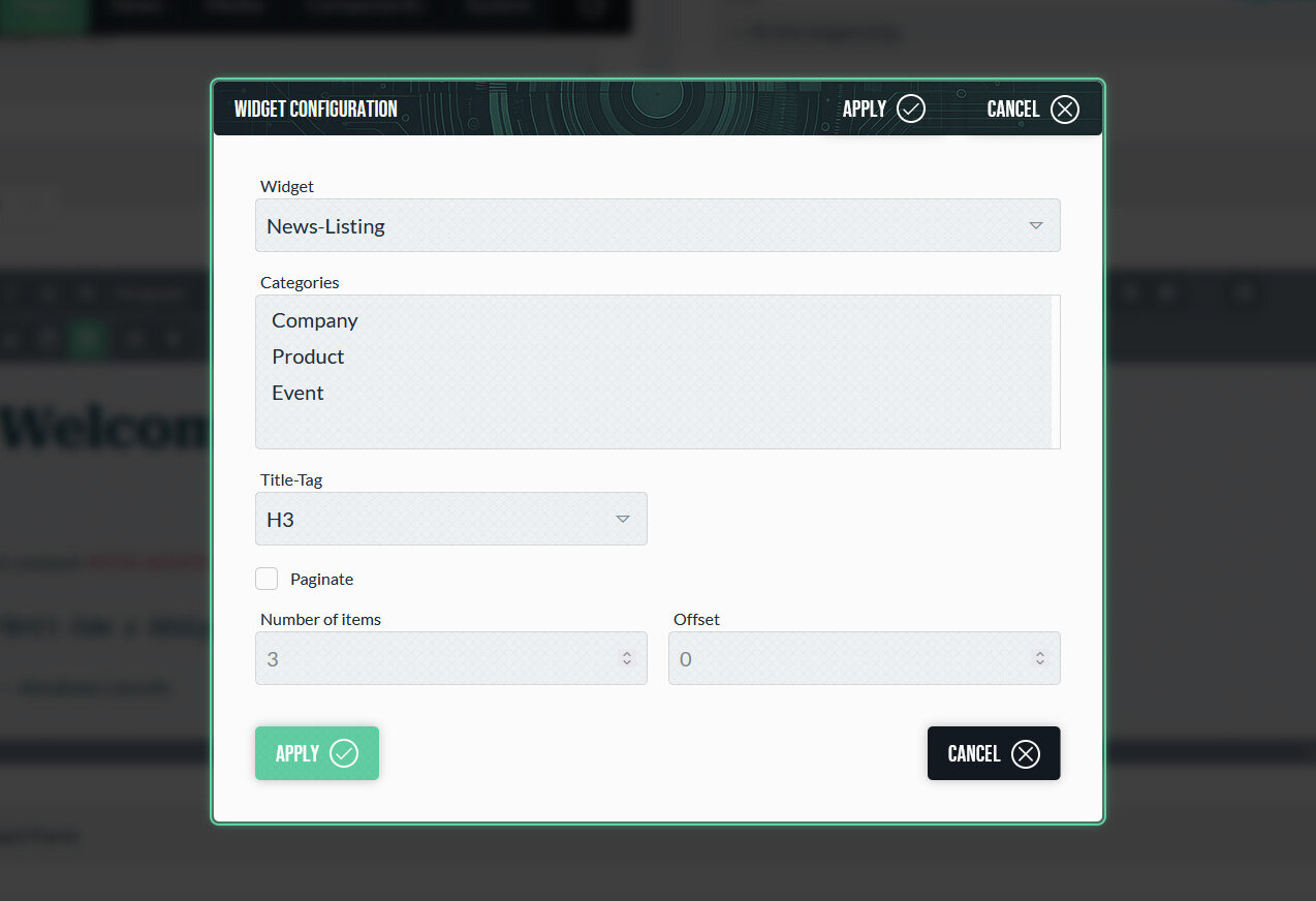 Widgets werden wie eigenständige Komponenten behandelt und lassen sich an verschiedenen Stellen einsetzen – beispielsweise innerhalb von Inhalten, Globalen Inhalten oder Templates. Im Backend können Redakteure über den Editor Widgets auswählen und ihre Einstellungen direkt anpassen. Im Frontend werden sie automatisch gerendert und in den Seitenaufbau integriert.