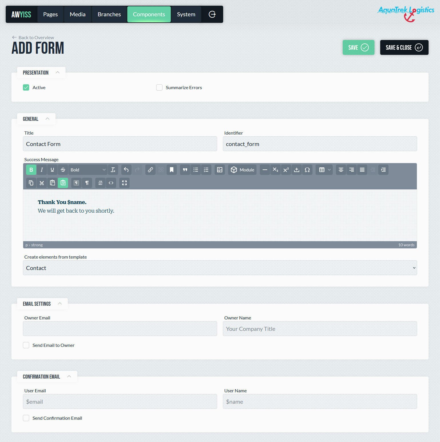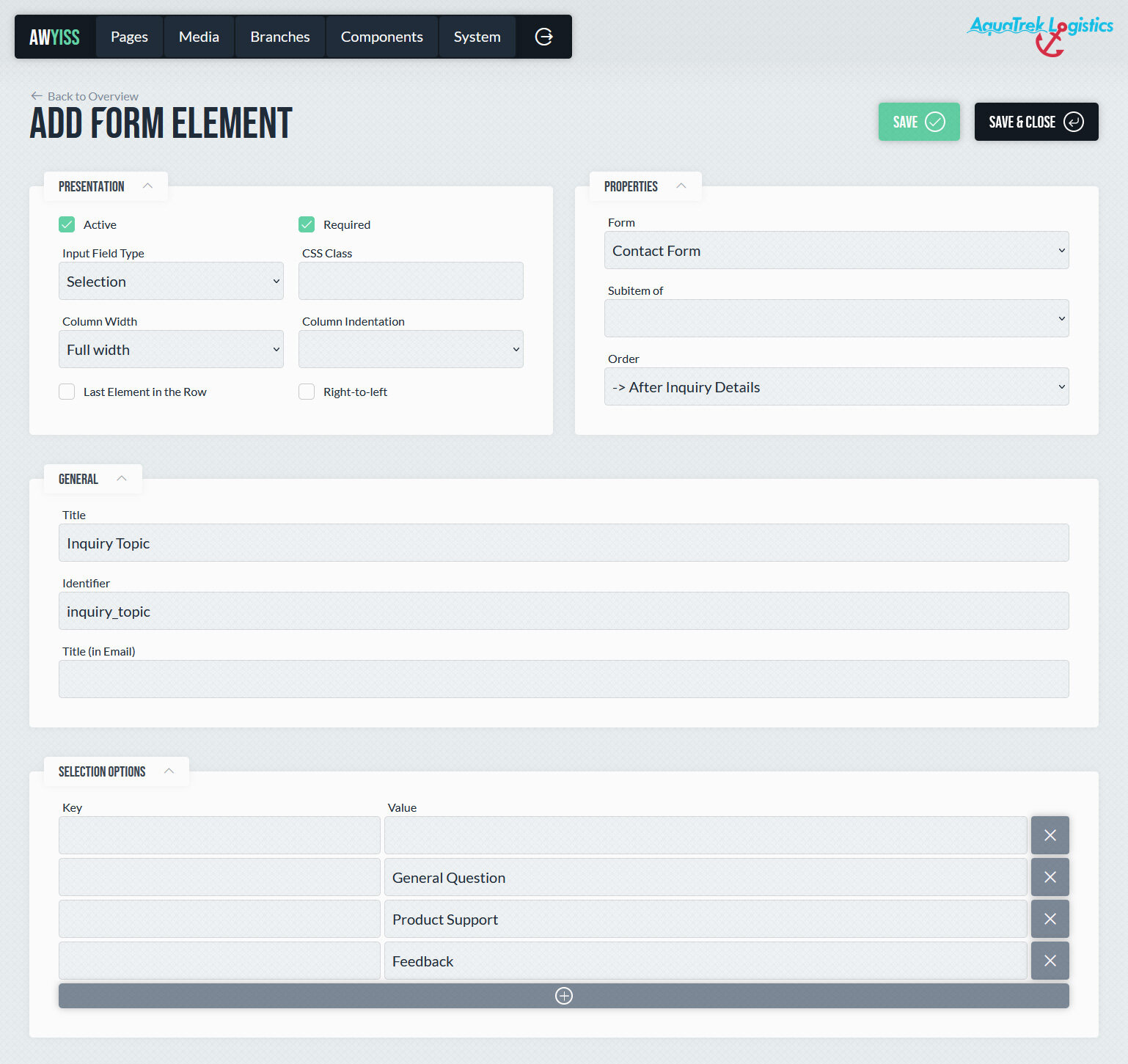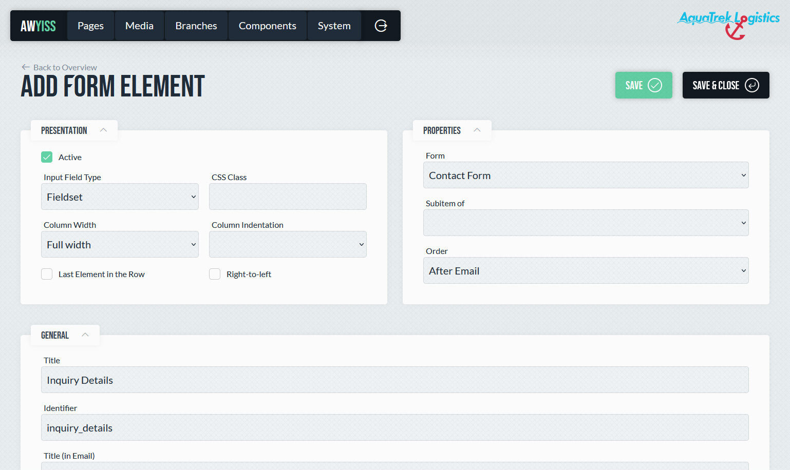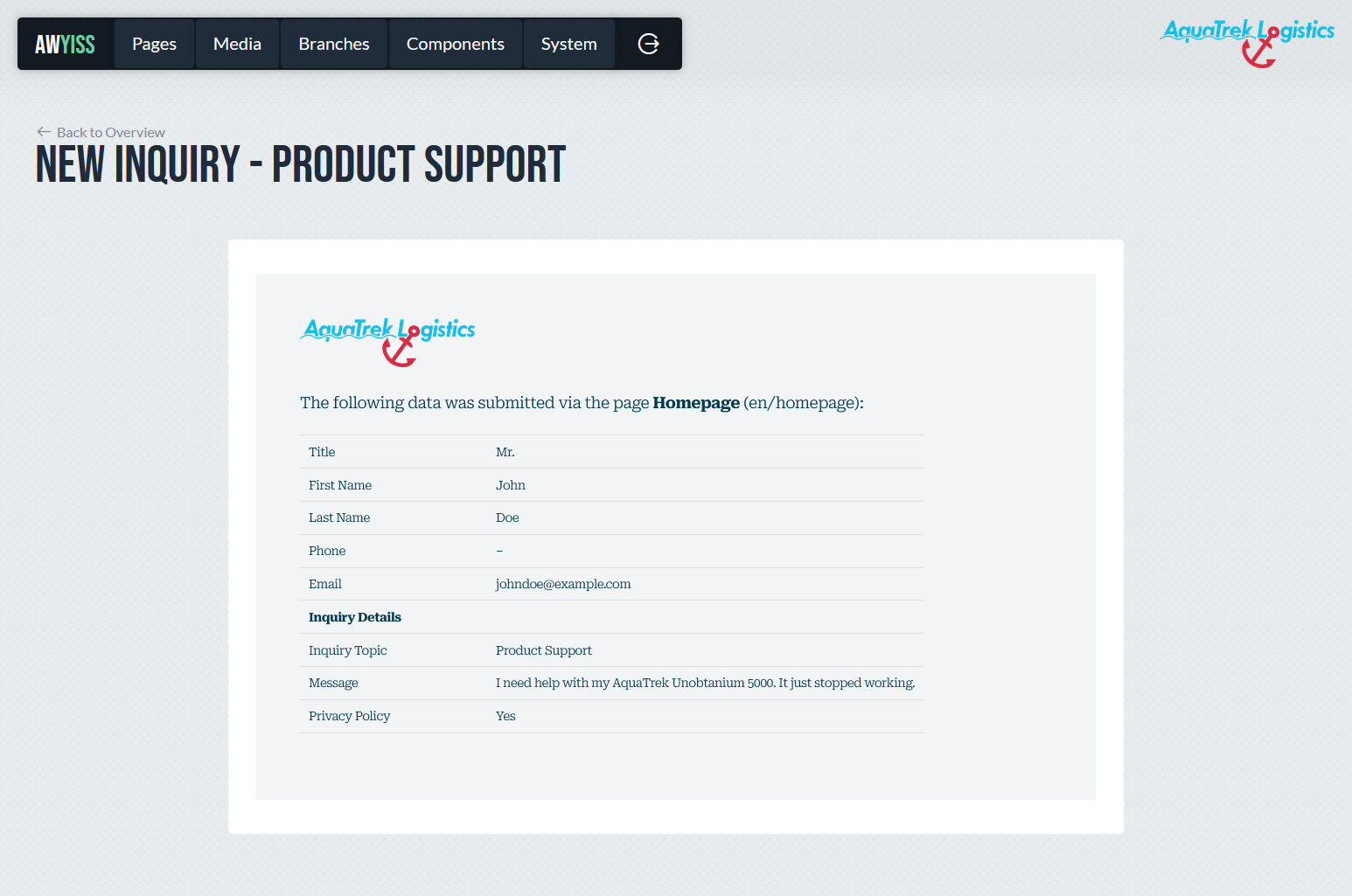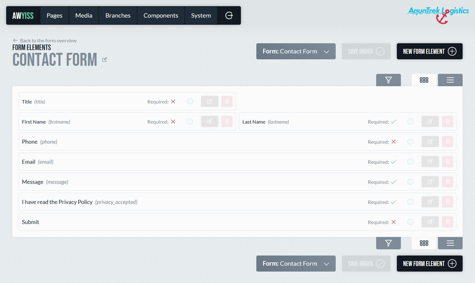 In Awyiss können Formulare direkt im Backend erstellt und verwaltet werden. Sie dienen dazu, Eingaben von Website-Besuchern zu erfassen und im System zu speichern – etwa für Kontaktanfragen, Newsletter-Anmeldungen oder andere Interaktionen. Nach dem Absenden werden die Daten gespeichert und können im Backend aufgerufen werden. Optional ist das Senden einer E-Mail an den Seitenbetreiber und/oder an den Kunden möglich.