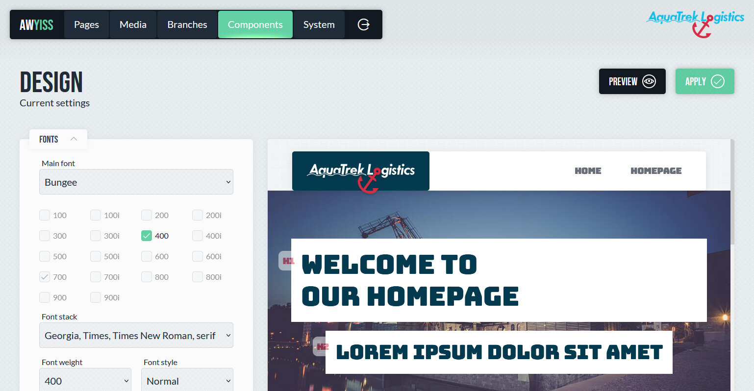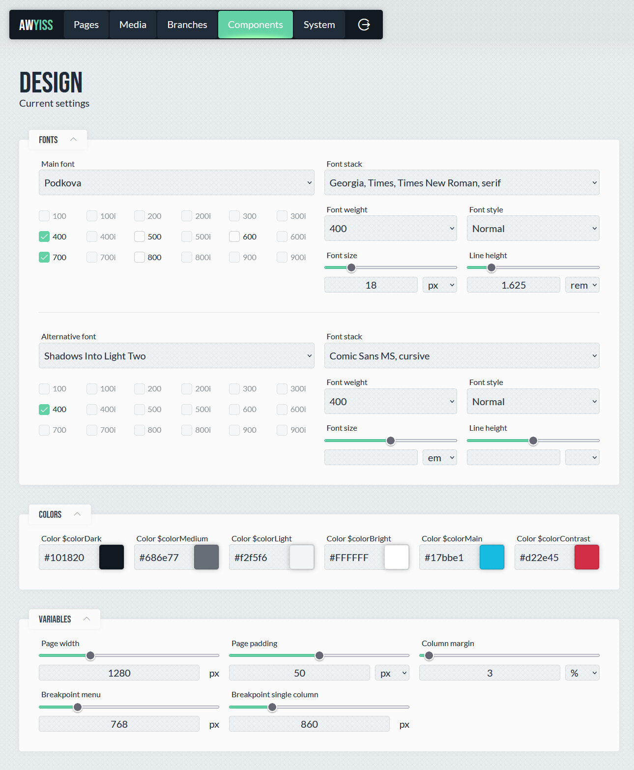 Das Design-System ist eine Stärke von Awyiss und bildet die Grundlage für ein konsistentes und erweiterbares Erscheinungsbild einer Website. Es ermöglicht die zentrale Definition und Verwaltung von Designparametern wie Farben, Schriftarten, Abständen und Komponenten, ohne dass direkt in Templates oder Stylesheets eingegriffen werden muss.