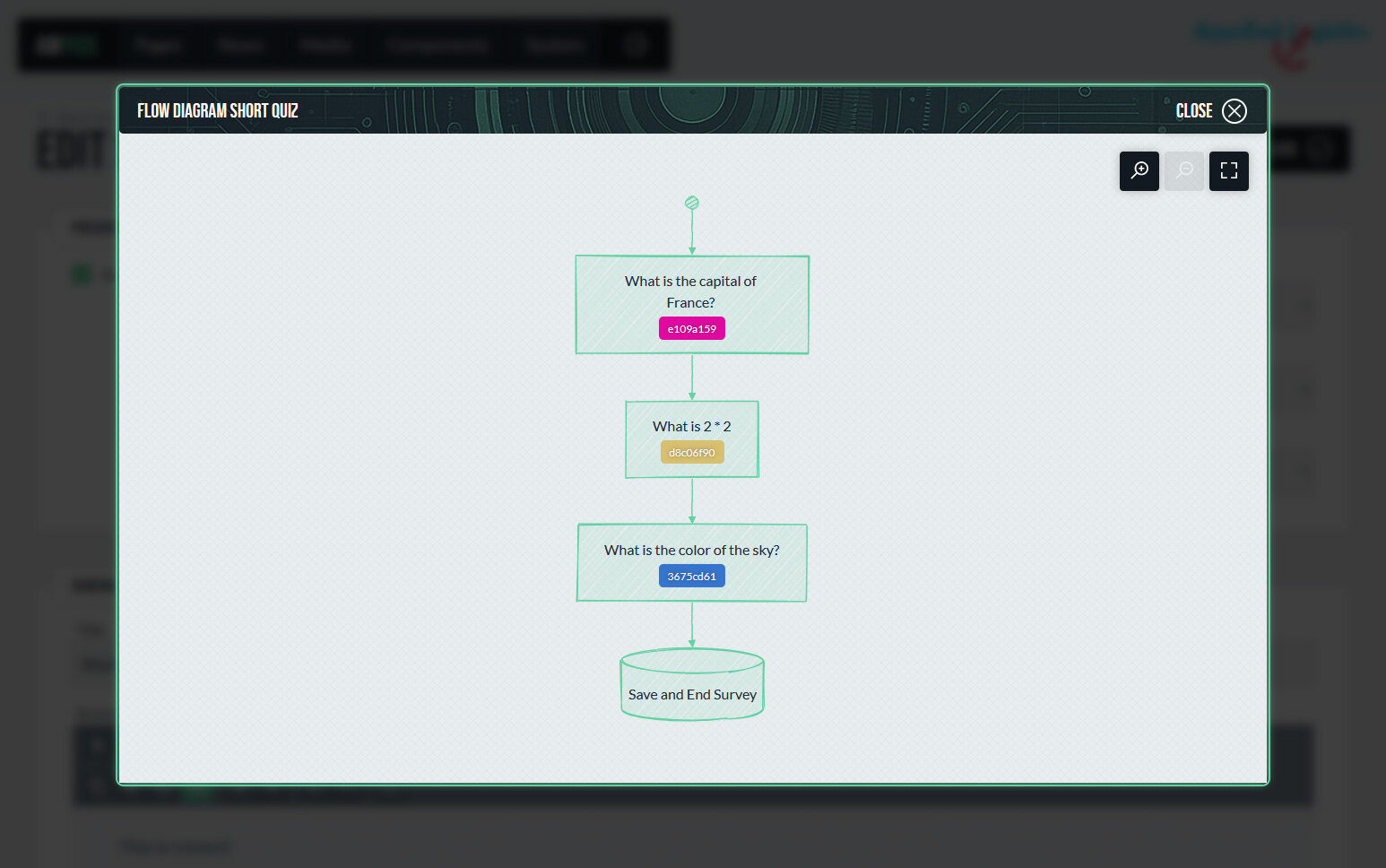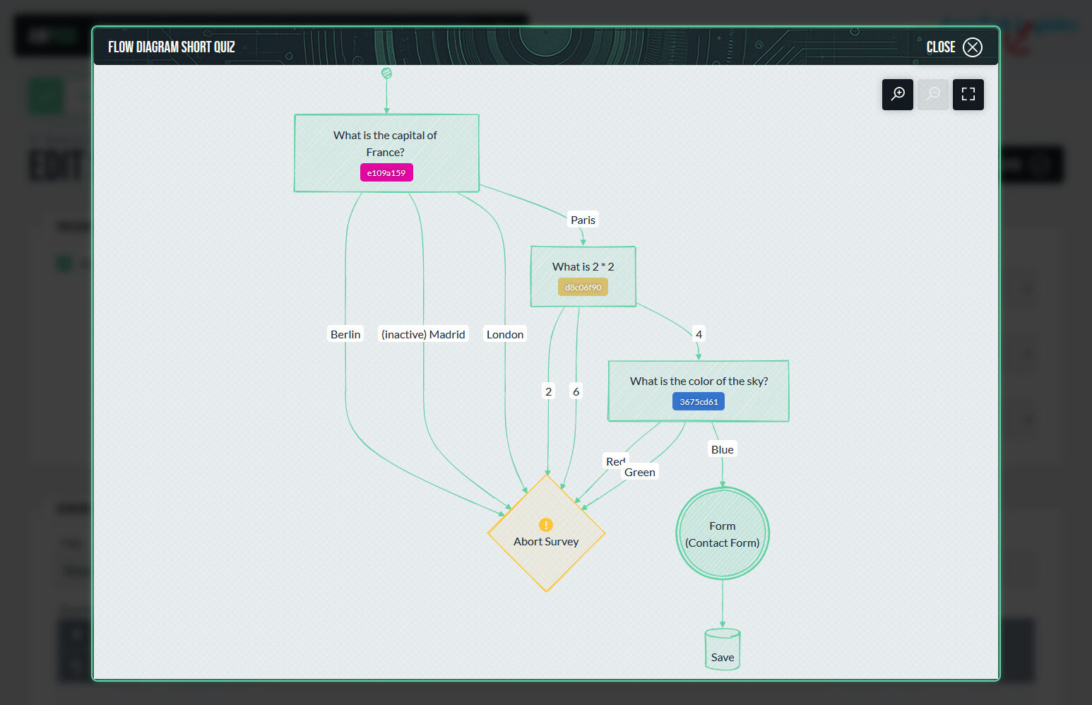 Zur besseren Übersicht zeigt das Backend ein automatisch generiertes Diagramm, das den vollständigen Ablauf der Umfrage darstellt. Es visualisiert, welche Fragen und Antworten zu welchen Folgeschritten führen, und macht so auch komplexe Verzweigungen leicht nachvollziehbar. Diese Darstellung dient vor allem der Kontrolle und Abstimmung im redaktionellen oder konzeptionellen Prozess.