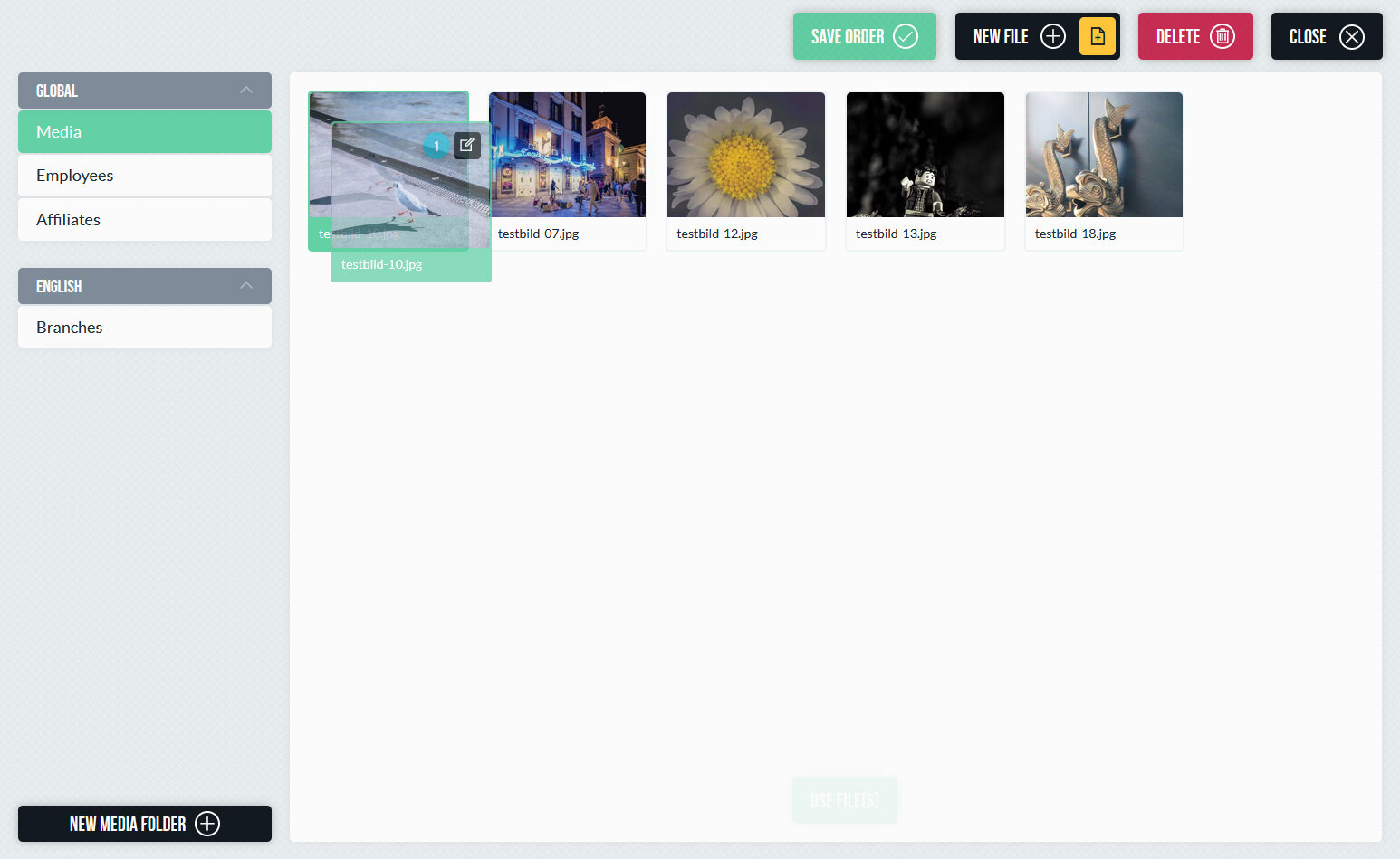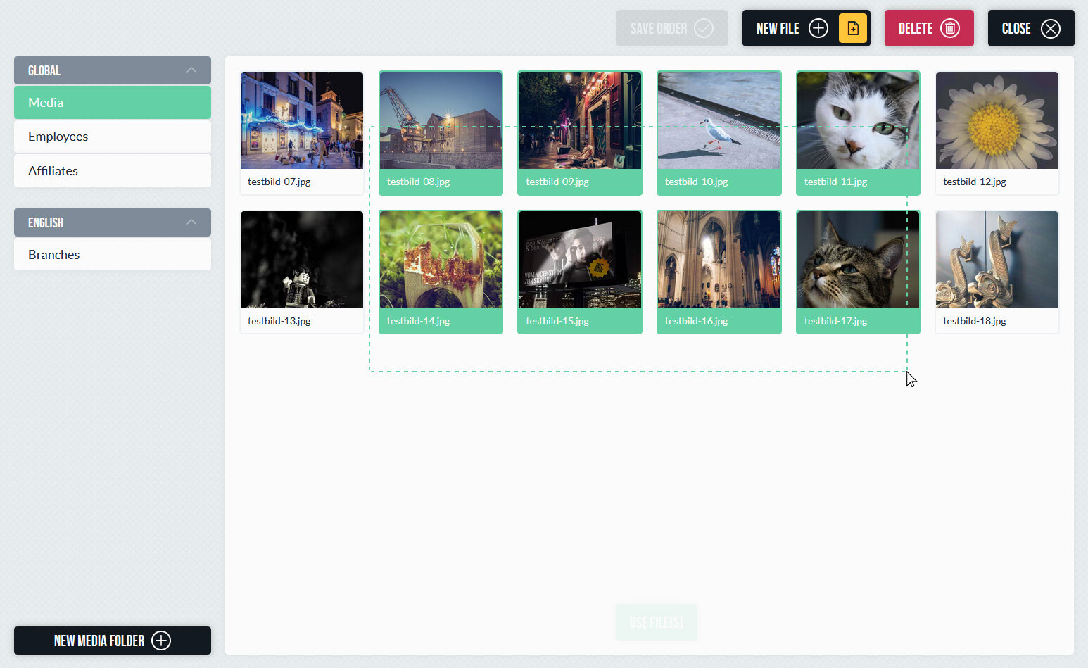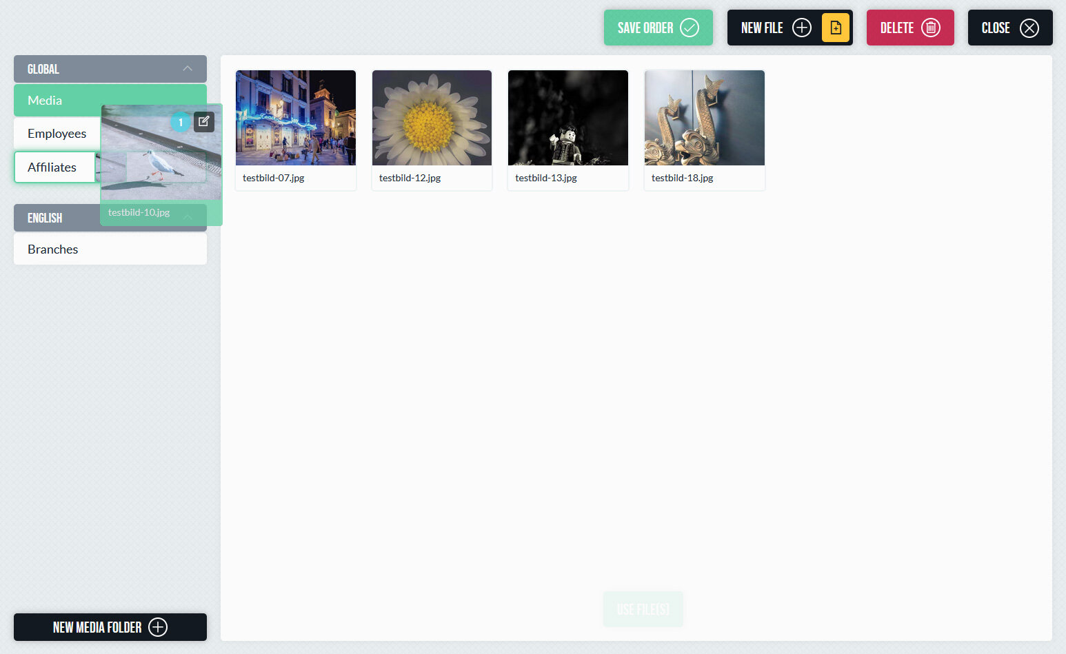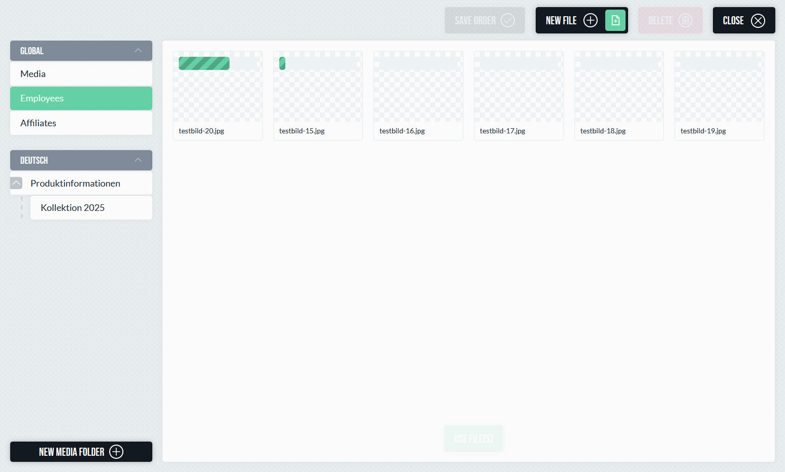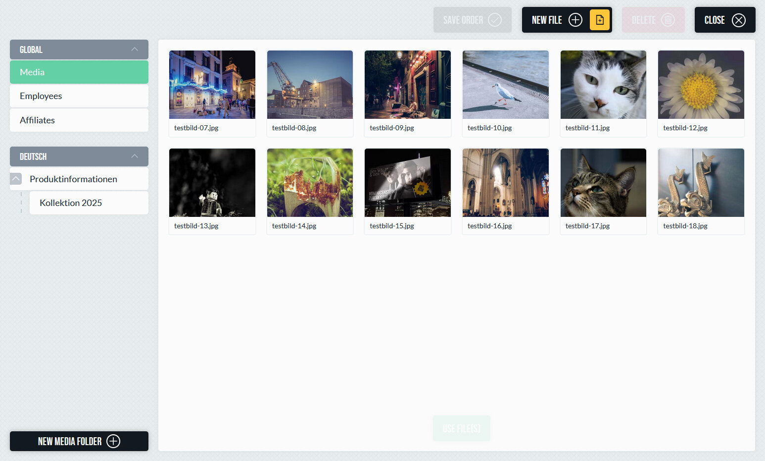 Medien können per Drag-and-Drop hochgeladen und in der passenden Struktur abgelegt werden. Das System unterstützt verschiedene Dateitypen und sorgt dafür, dass Bilder im Frontend automatisch in der jeweils passenden Größe ausgeliefert werden. Die Berechnung der Bildgrößen erfolgt kontextabhängig – es müssen keine festen Größen pro Ordner oder Datei definiert werden. Dadurch wird stets die tatsächlich benötigte Variante erzeugt und ausgeliefert, ohne unnötig große Dateien zu verwenden.