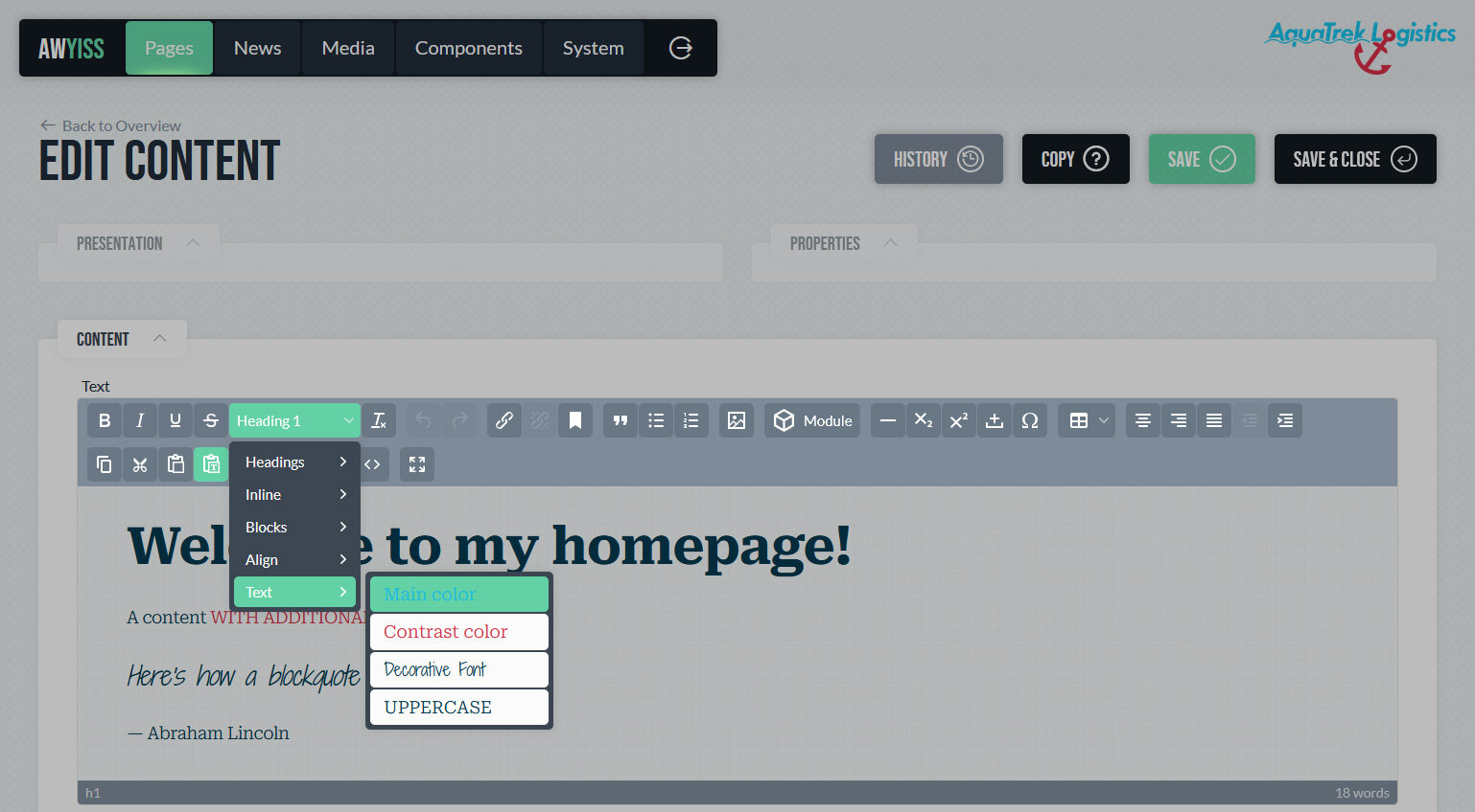 Des Weiteren verwendet Awyiss für die Darstellung von Texten in Rich-Text-Editoren und der Versionsansicht die im Frontend-Design definierten Stile, um Inhalte bereits während der Bearbeitung so darzustellen, wie sie später im Frontend erscheinen. Dadurch wird die Bearbeitung deutlich intuitiver und der gestalterische Zusammenhang jederzeit sichtbar.