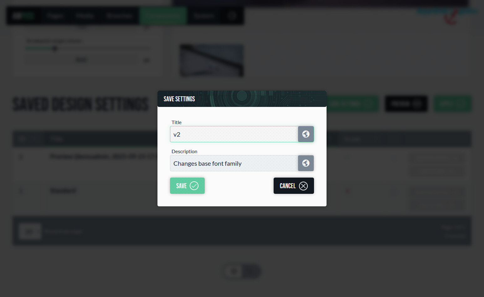 Ein Design fasst diese Parameter zu einer vollständigen Konfiguration zusammen. Es kann global für die gesamte Website aktiviert werden oder als alternative Variante dienen, um unterschiedliche Einstellungen intern zu vergleichen und abzustimmen. Dadurch lassen sich Designanpassungen vorbereiten, testen und visuell kommunizieren, bevor sie live geschaltet werden.