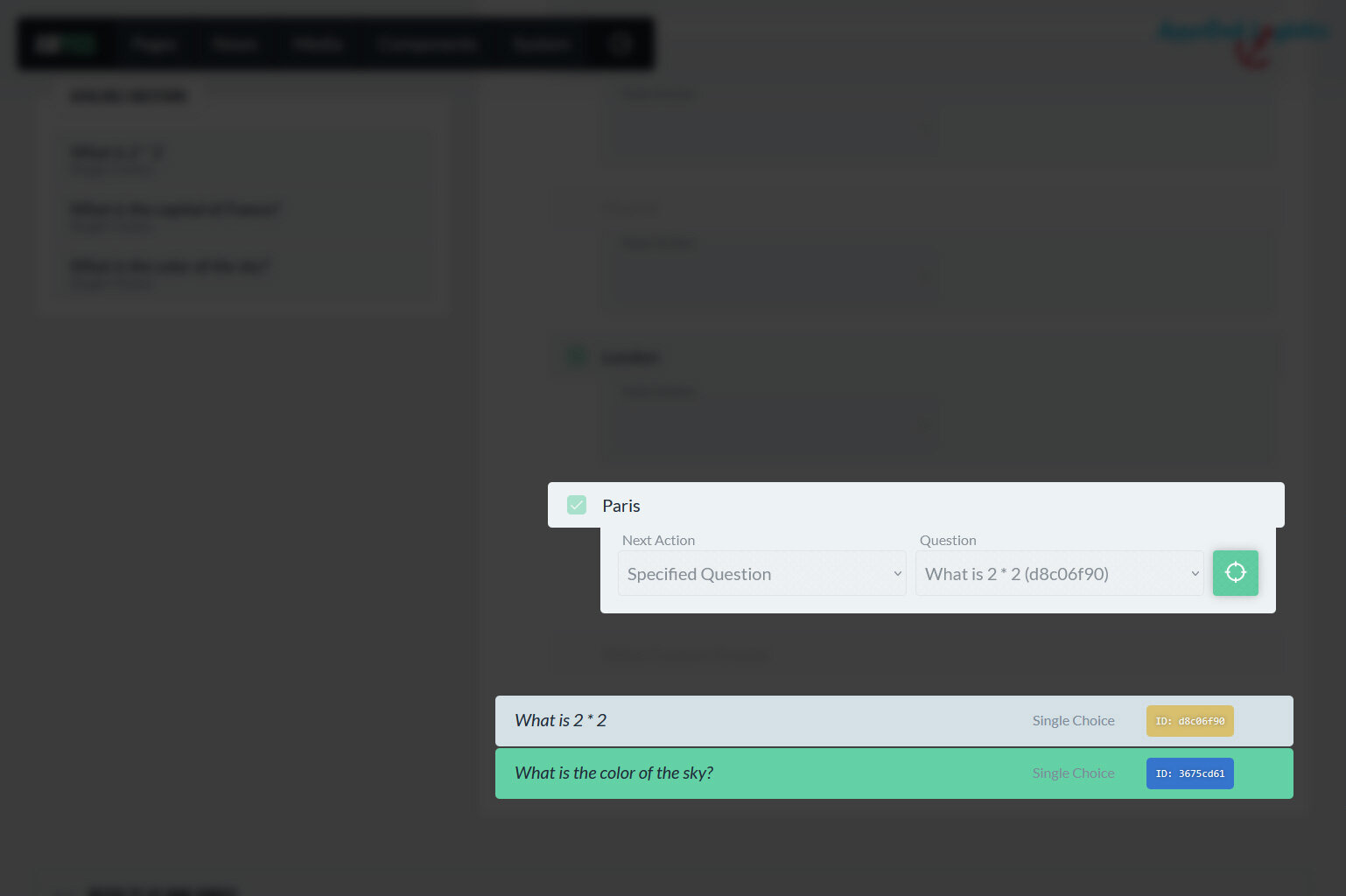 Die Reihenfolge und Logik der Umfrage lassen sich frei festlegen: Sowohl Fragen als auch – bei Einfachauswahlfragen – einzelne Antworten können bestimmen, welcher Schritt als Nächstes erfolgt. Dabei kann das System entweder zu einer weiteren Frage oder zu einem Formular leiten, oder die Umfrage (vorzeitig) speichern und/oder beenden. Dadurch lassen sich flexible und verzweigte Abläufe umsetzen, die sich präzise an individuelle Nutzungsszenarien anpassen.