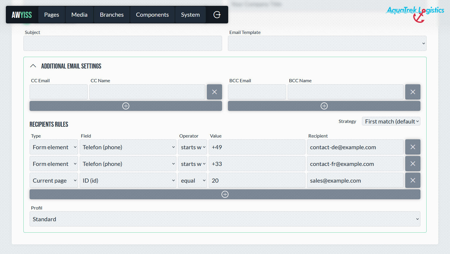 Awyiss ermöglicht die Definition bedingter Empfänger innerhalb eines Formulars. Dabei kann abhängig von bestimmten Eingaben – etwa einer Auswahl im Formular – festgelegt werden, an welche internen Empfänger eine E-Mail gesendet werden soll. So lassen sich Anfragen automatisch an die jeweils zuständige Abteilung oder Person weiterleiten, ohne dass mehrere separate Formulare benötigt werden.