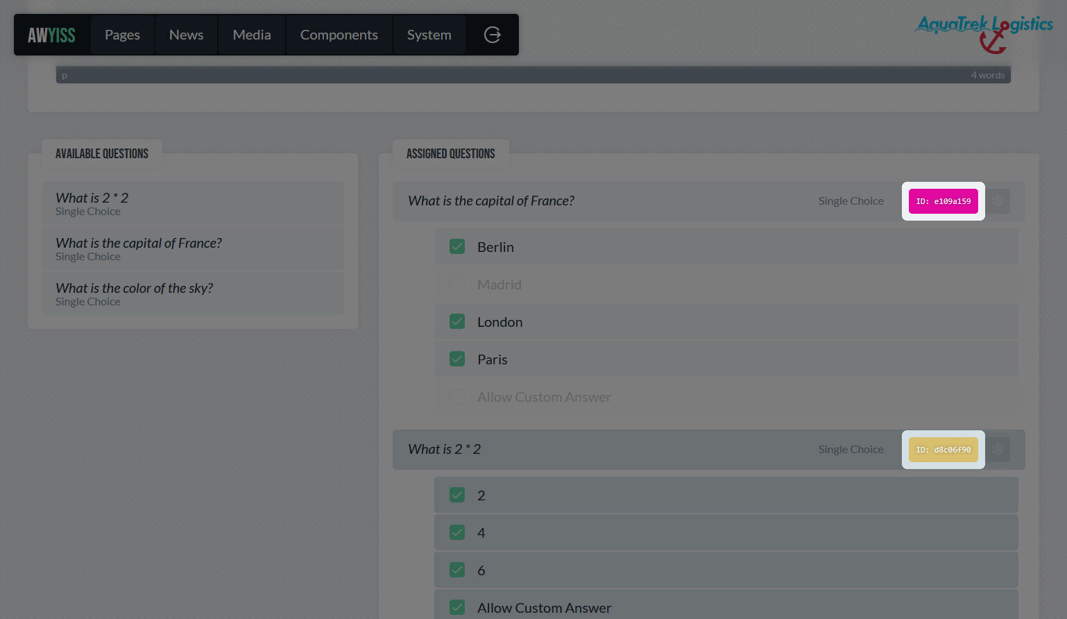 Mit dem Umfrage-System bietet Awyiss eine integrierte Möglichkeit, Besucherfeedback direkt innerhalb des CMS zu erfassen. Es ermöglicht die Erstellung und Verwaltung von Umfragen, Abstimmungen oder kurzen Fragebögen, ohne externe Tools oder Erweiterungen einsetzen zu müssen. Alle Formulare und Antworten werden im System gespeichert und lassen sich über das Backend verwalten.